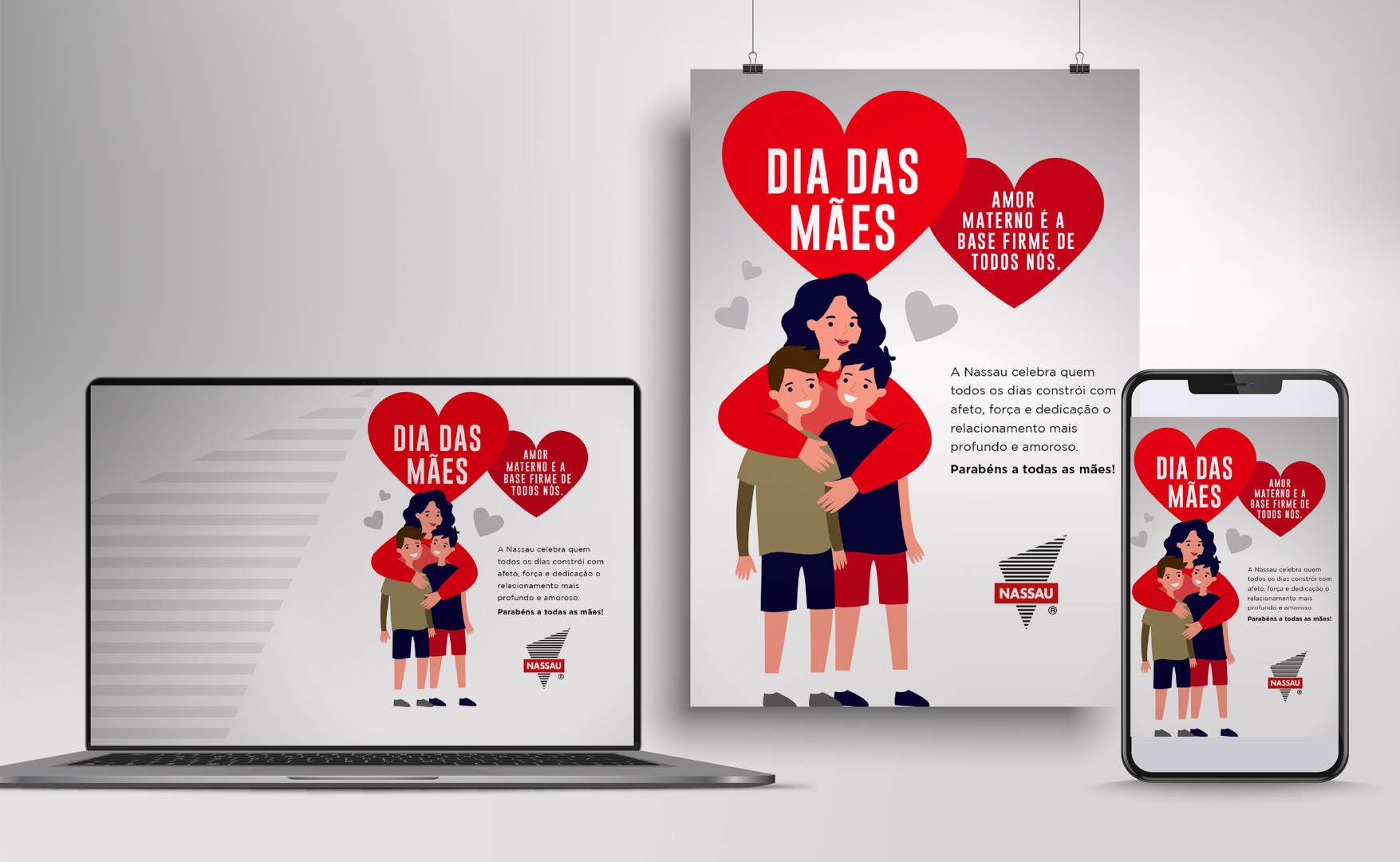 A campanha foi composta por cartazes, posts digitais e newsletter, distribuídos nos canais de comunicação da empresa, com destaque para a plataforma interna Nassau Conecta.